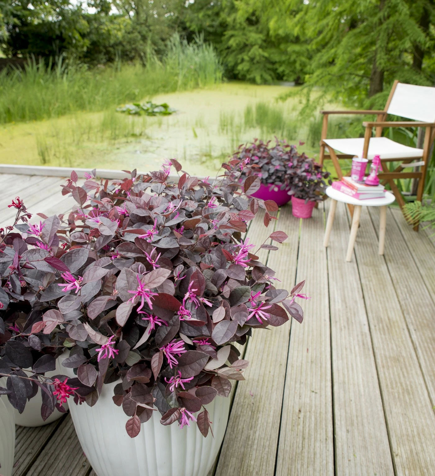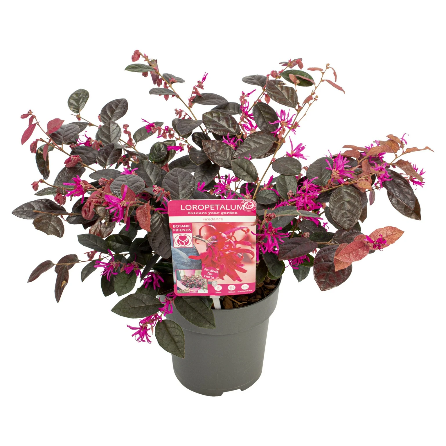 Loropetalum chinense ‘Fire Dance’ is een opvallende heester met donkerpaars blad en helderroze, franjerige bloemen. Deze plant geeft een exotische uitstraling aan de tuin en bloeit rijkelijk in het voorjaar. Dankzij zijn compacte vorm is hij ook perfect voor potten op terras of balkon.