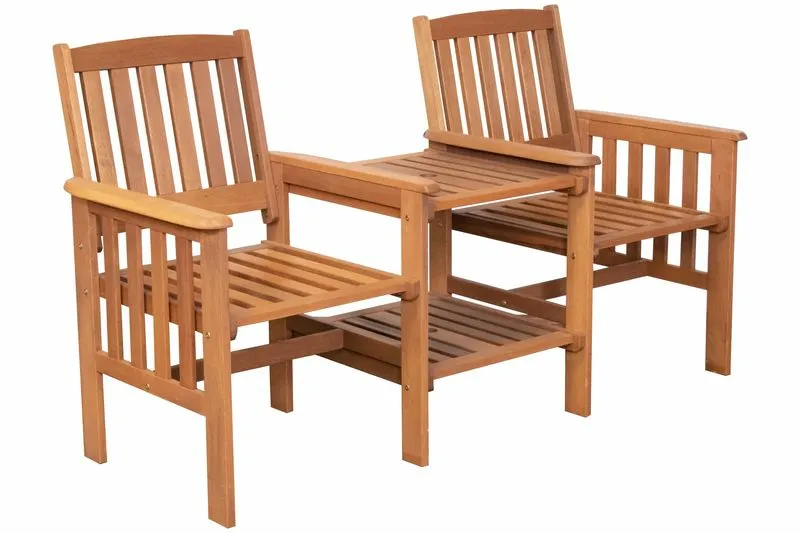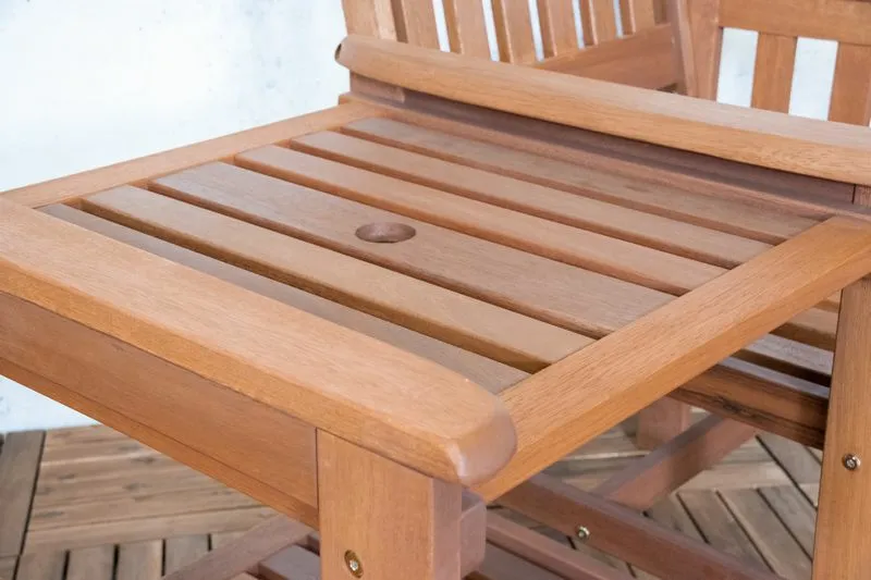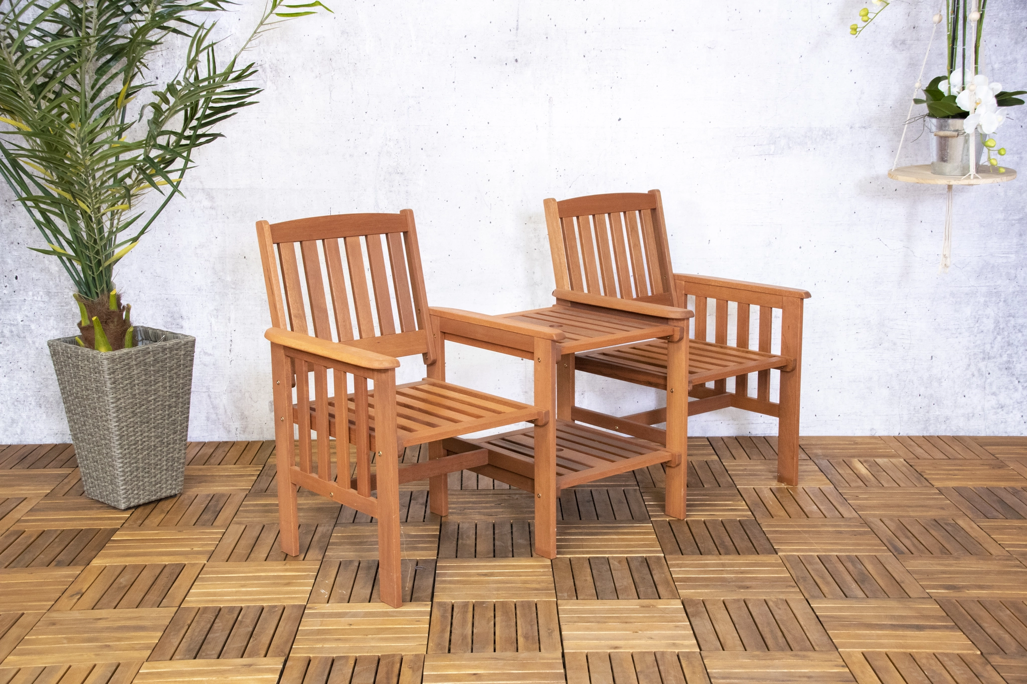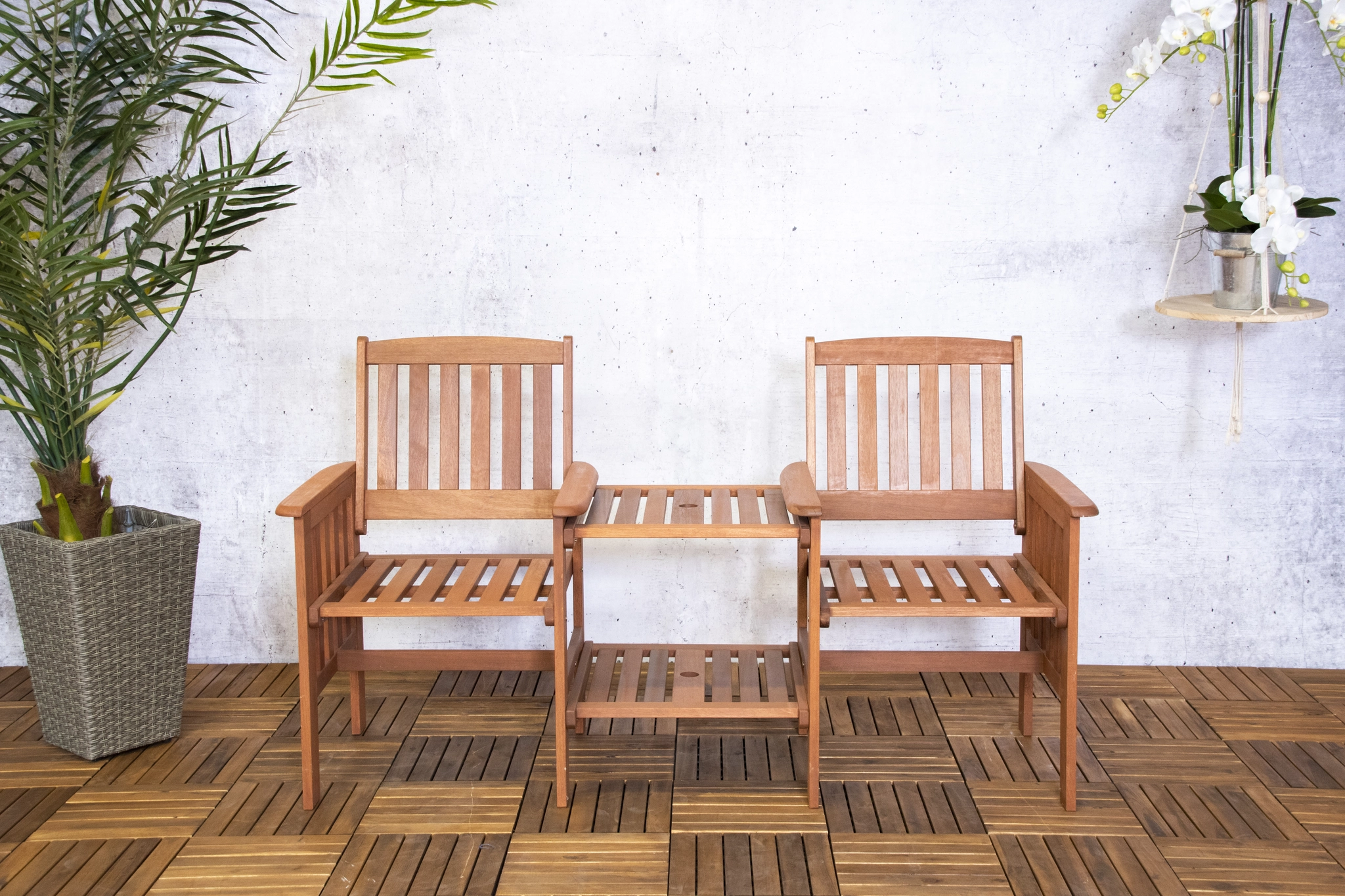 Dankzij het tropisch hardhout is deze bank bestand tegen verschillende weersinvloeden en gaat hij jarenlang mee. Het hout heeft een warme uitstraling en kan eventueel behandeld worden voor een langere levensduur en behoud van kleur. Het ingebouwde tafeltje biedt ruimte voor drankjes, planten of accessoires, waardoor deze tête-à-tête bank niet alleen praktisch, maar ook decoratief is.