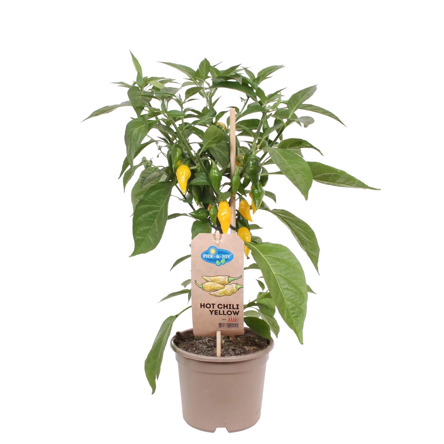 Pick-&-Joy® hete peper geel (50 cm, potmaat 14) is een kleurrijke en pittige peperplant die je tuin en keuken verrijkt. Perfect voor liefhebbers van spicy food, geschikt voor zon of halfschaduw.